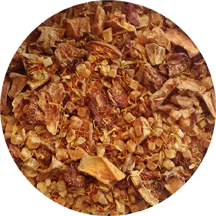 Fruit tea blend of highest rank! Extra large akes and cubes of juicy, exclusively exotic fruits form the base of the mango cubes, pineapple cubes, orange slices,freeze-dried tangerine -orange pieces. A very delicious Mango tea, which will outshine many other juice drinks. ( Caffeine Free )